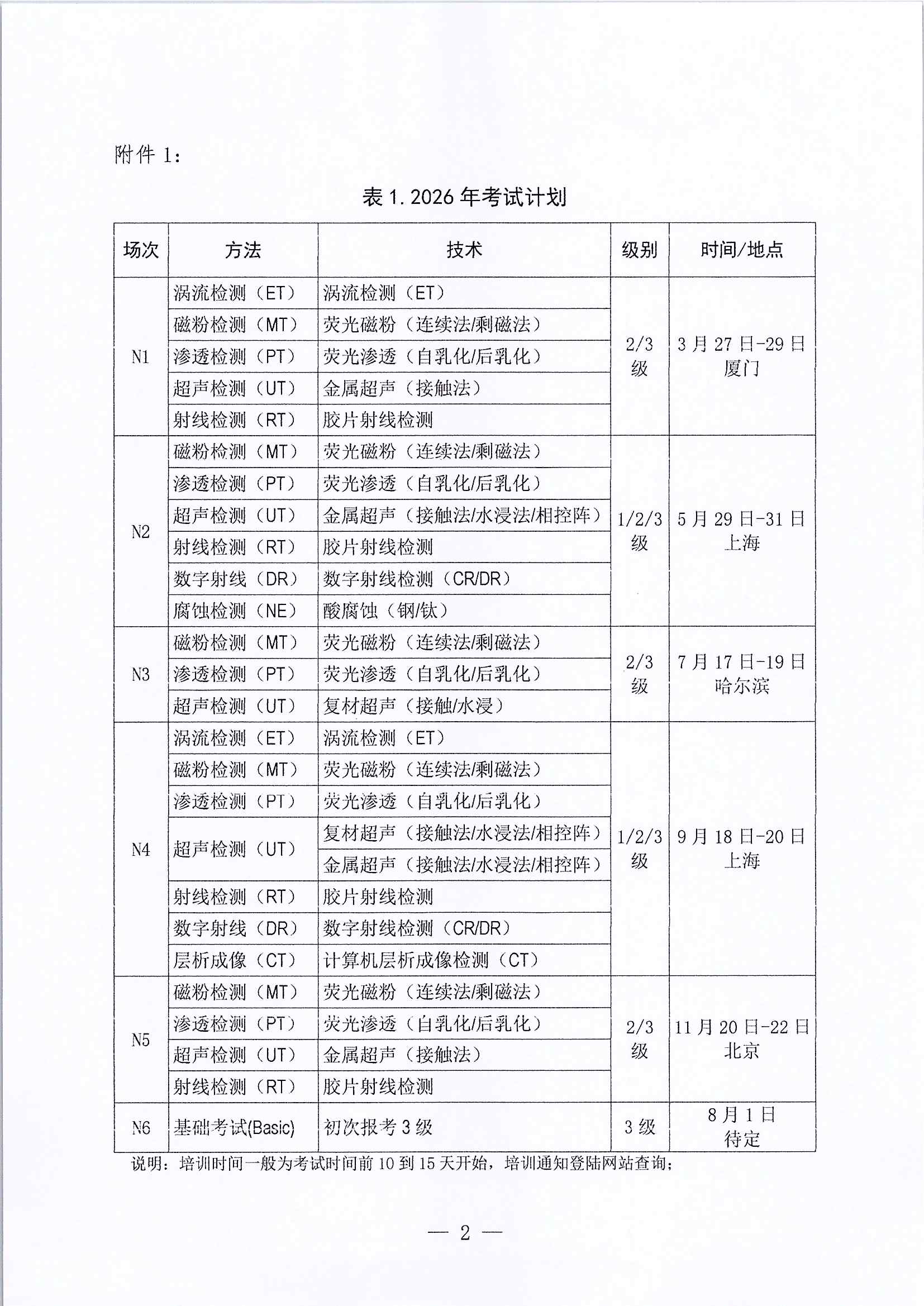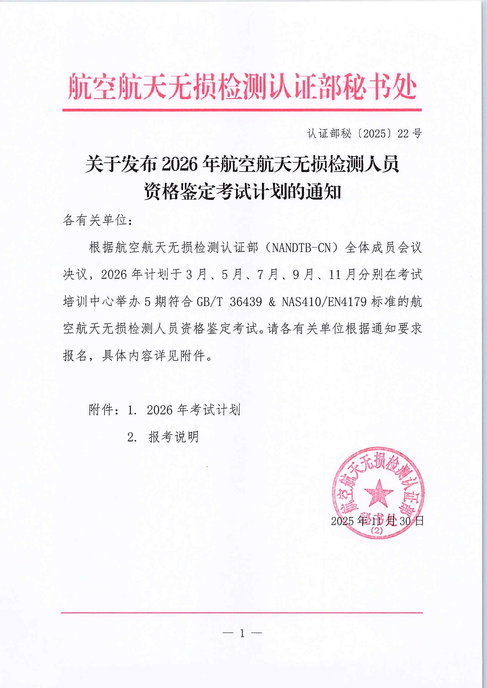 关于发布2026年航空航天无损检测人员资格鉴定考试计划的通知